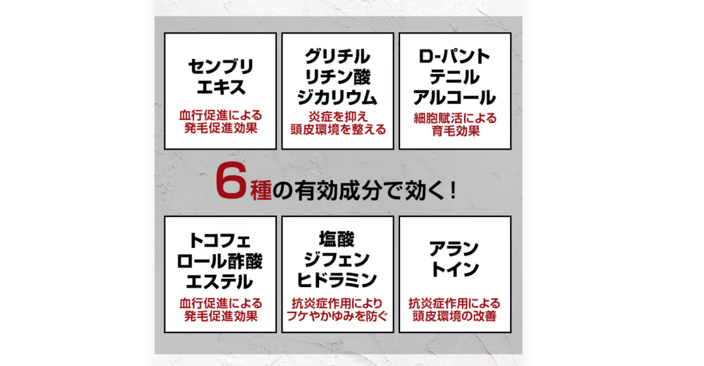 | センブリエキス | 血行促進作用があり、頭皮の血流を良くすることで毛根への栄養供給をサポート | 比較的安全性は高いが、まれにかゆみや赤みなどの皮膚刺激を感じる場合あり |