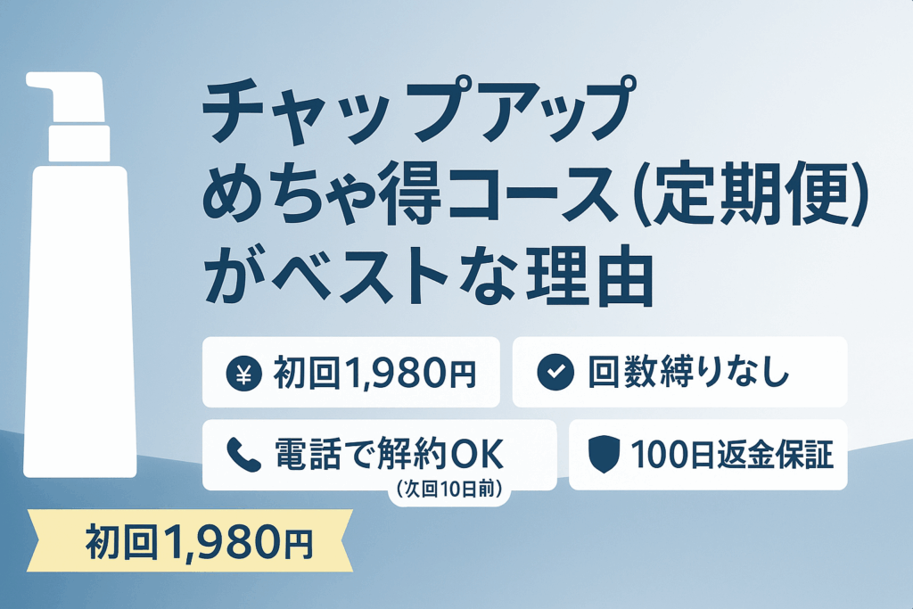 チャップアップのめちゃ得コース(定期便)を選ぶなら、まず価格・期間(縛り)・解約方法の3点を押さえるのが近道です。